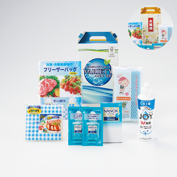 ●セット内容:除菌ジョイコンパクト170ml、ナノックスワンプロ10gx2包、リードクッキングペーパー4枚入、冷凍・冷蔵新鮮保存マチ付フリーザーバッグ2枚、ネットスポンジ ●化粧箱入り |