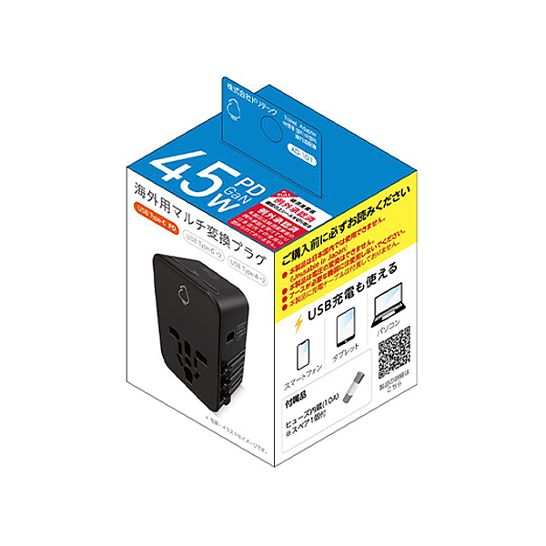 ●200以上の国と地域に対応する4タイプのコンセント形状。 ●45W(単独接続時)PD対応のUSB Type-C 1口 ●複数の携帯機器を同時に接続 ※最大5台USB充電可能 ●3口のUSB Type-Cポート搭載 ●2口のType-Aポート搭載 ●交換可能ヒューズ内蔵(スペア1個付) ●商品重量:約165g ●入力:AC100〜240V 50/60Hz、 10A(ACコンセント)+1A(USB充電器) ●ACコンセント出力:AC100〜240V/10A(パススルー) ※110Vの地域では1100W以上の機器は使用できません。 ●USBポート出力 USBーTypeC(PD):単独接続時 45W、複数接続時 30W ●USBポート出力 USBーTypeC(5V):単独接続時 Type-C(5V) 5V/3A ●USBポート出力 USB-A×2:単独接続時 Type-A 5V/2.4A、複数接続時 合計3A ●付属品:スペアヒューズ×1個(本体内蔵) ●ヘッダー付き化粧箱入り |