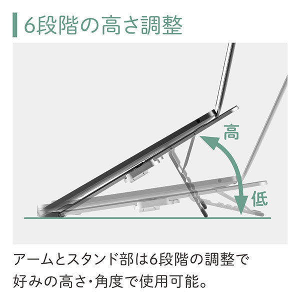 ●約190gで軽量&手のひらサイズ! ●持ち運びが簡単で外出先でも使いやすい。 ●アームとスタンド部は6段階の高さ調整。 ●好みの高さ・角度で使用可能。 ●机やノートパソコン・タブレットが傷ついてしまうことを防ぐ、保護パッド付 ●専用の収納ポーチ付きで、パソコンケースやカバンへの収納に便利。 ●セット内容:本体、収納ポーチ、取扱説明書 ●対応サイズ:11〜15.6インチノートパソコン・タブレット ●質量:約190g ●耐荷重:5kg |