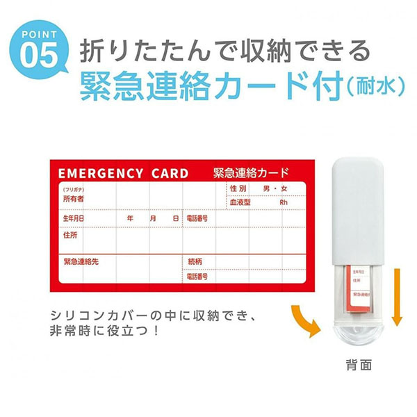 ●超コンパクト。 ●大音量85dBで、緊急時に助けを呼べる。 ●ライトは点灯、点滅の2段階。 ●LEDライトで長持ち。 ●白色ライトで足元まで明るい。20ルクス。 ●連続点滅:約60時間 ●連続点灯:約30時間 ●シリコンと樹脂のダブル構造で丈夫で壊れにくい。 ●書いて消せる一言メモ欄付。 ●シリコンカバーの中に緊急連絡カード(耐水)が収納でき、非常時に役立つ! ●金属製フック ●CR1632コイン型リチウム電池2個使用(別売) ●重量:24g ●ブリスターケース入り |