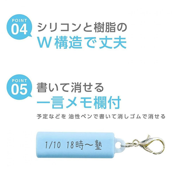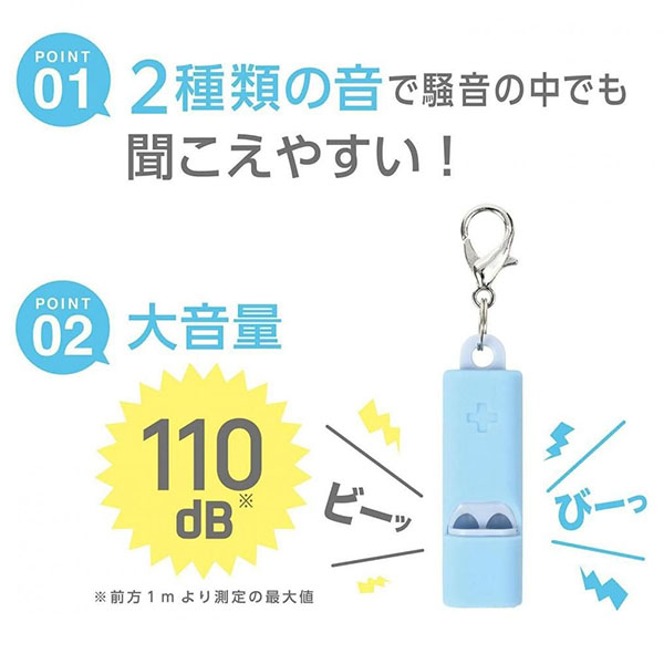 ●超コンパクト。 ●大音量110dBで、緊急時に助けを呼べる。 ●2種類の音で雑音や騒音の中でも聞こえやすい。 ●吹き口がシリコンなので清潔でくわえやすい。 ●シリコンと樹脂のダブル構造で丈夫で壊れにくい。 ●書いて消せる一言メモ欄付。 ●シリコンカバーの中に緊急連絡カード(耐水)が収納でき、非常時に役立つ! ●金属製フック ●ネックストラップ(安全ストラップ) ●重量:4.5g ●ブリスターケース入り |