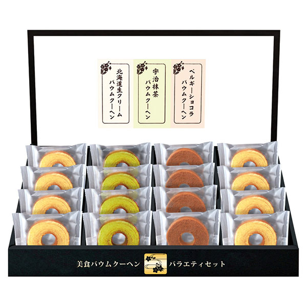 ●上品な甘味の北海道生クリーム、抹茶の香りが広がる宇治抹茶、ほろ苦いビターな味わいのベルギーショコラの3種類がセットになっています。 ●セット内容:ミニバウムクーヘン(北海道生クリーム)×8、ミニバウムクーヘン(宇治抹茶・ベルギーショコラ)×各4 ●アレルギー:卵、乳、小麦 ●重量:約700g ●化粧箱入り |