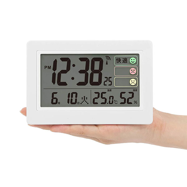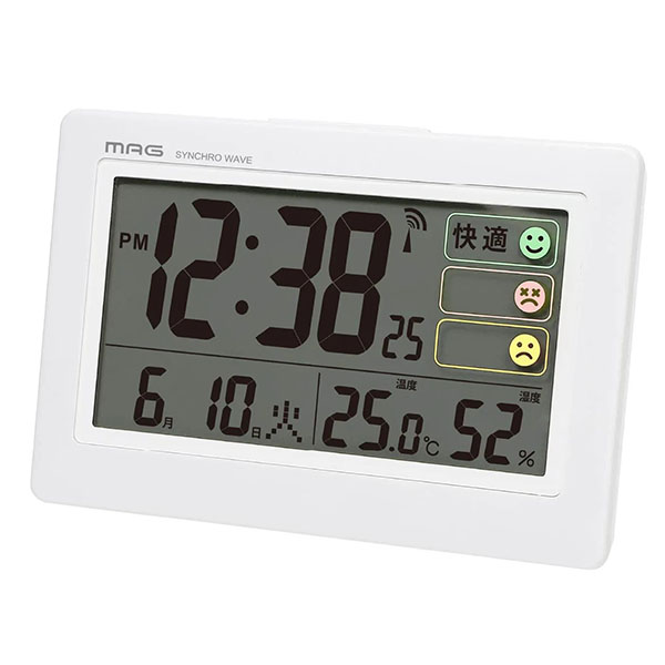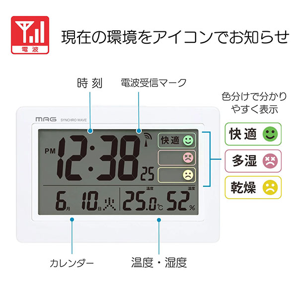 環境アイコンと大きな表示で見やすいデジタル電波時計。