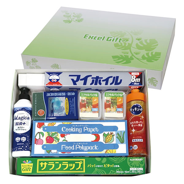 ●セット内容:サランラップ30cm×10m、アルミホイル25cm×8m、ライオンチャーミーマジカ220ml、花王キュキュット220ml、クッキングペアーセット(キッチンペーパー・ポリ袋各10枚)、Wスポンジ、保存容器100ml×2 ●重量:995g ●箱入り ※ギフトセット商品は、カタログ期間中に、内容・デザイン等変更になる場合がございます。 |