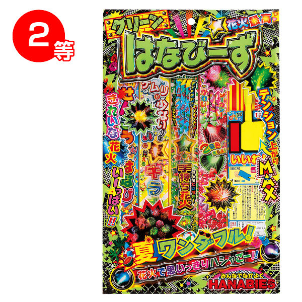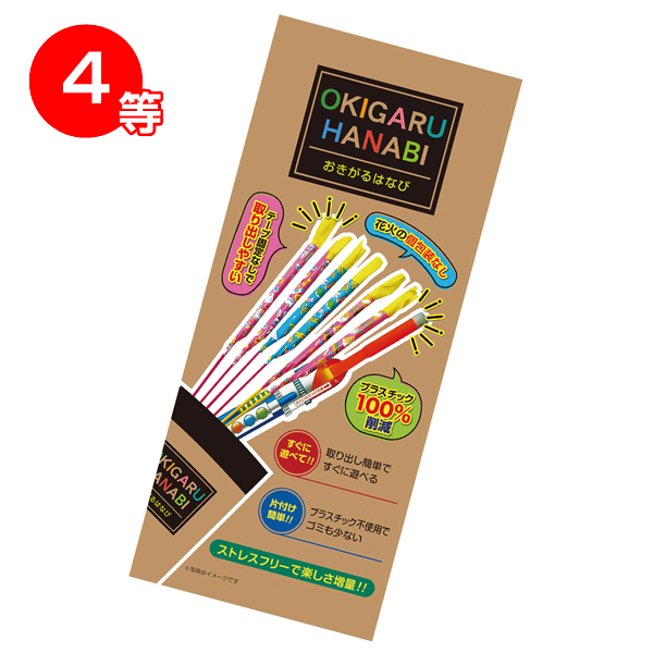 ●セット内容 特賞:ハーフ&ハーフ 色変&長い時間 5本 1等:はなびーずL 5本 2等:はなびーずS 10本 3等:はなびーずXS 10本 4等:おきがるはなび 20本 ●付属品:抽選くじ×50、抽選箱×1、くじ明細書×1、告知用A4カード×1 ※お支払いは銀行振込でお願いいたします。 |