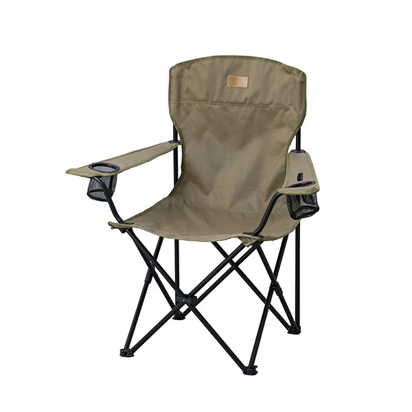 ドリンクホルダー2個とスマホホルダーが付いている便利なキャンプチェア。