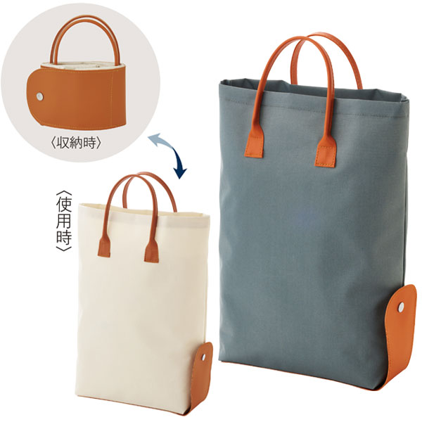 ●上品なくすみカラーの折りたたみトート。 ●本体側面にボタンを留めるとマチあり仕様に。 ●ポリ袋入り |