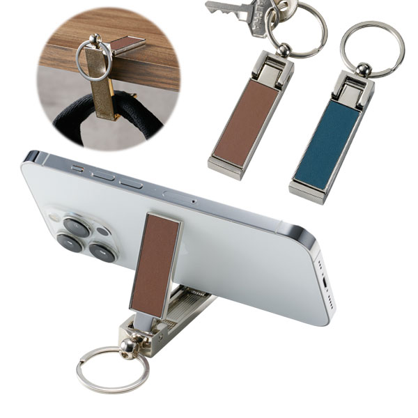 キーホルダー形状で持ち歩けるスマホスタンドにもなるバッグハンガー。
