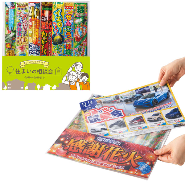 ●チラシを入れられるポケット付き。 ●花火ルール10ヶ条 1.使用する前に明るいところで注意書をよく読んでから遊びましょう。 2.花火を分解したりほぐしたりしてはいけません。大変キケンです。 3.花火の点火にマッチやライターを使ってはいけません。蝋燭や点火用線香で点火してください。 4.お子様は大人と一緒に遊びましょう。 5.花火は必ず広い場所で遊びましょう。人や家に向けたり、振り回したり、燃えやすい物の側で遊ばないようにしましょう。 6.花火は1本ずつ、風下に向けて点火しましょう。また、花火をしている人の前後に立たないようにしましょう。 7.バケツに水をいっぱい用意しましょう。 8.風の強い日には、花火遊びをやめましょう。 9.花火が途中で消えたり、なかなか点火できない場合でも、絶対に覗いたり顔や体を近づけてはいけません。 10.遊ぶ場所や時間は、他の人の迷惑にならないようにし、花火遊びが終わったら、ゴミは必ず持ち帰りましょう。 ●オリジナル台紙も作成可能。詳しくはお問い合わせください。 ●包装袋入り(ポケット付) |