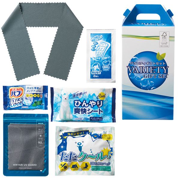 ●セット内容:ヒンヤリUVガードスリムクールタオル、たたクール瞬間冷却パック、ひんやり爽快シート20枚入、熱冷却シート2枚入、花王バブエクストラクール1錠(ミントの香り) ●ヒンヤリUVガードスリムクールタオル:UVカット率90%以上。濡らしてひんやり。 ●たたクール瞬間冷却パック:叩くだけですぐにひんやり。 ●手提げボックス入り |