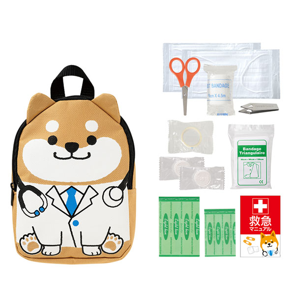 | 材質 | ポーチ:ポリエステル マニュアルカード:紙 PBT包帯:PBT サージカルテープ:ポリエステル 不織布三角巾:ポリエステル ばんそうこう:塩化ビニール はさみ:ステンレス鋼、PP とげ抜き:ステンレス鋼 圧縮不織布タオル:ポリエステル マスク:PP |