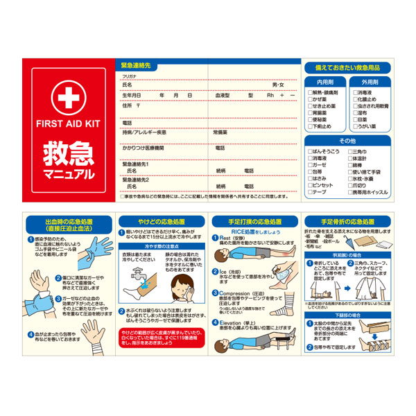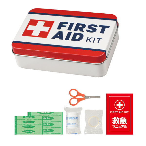 | 材質 | 缶:スチール マニュアルカード:紙 PBT包帯:PBT サージカルテープ:ポリエステル ばんそうこう:塩化ビニール はさみ:ステンレス鋼、PP |
