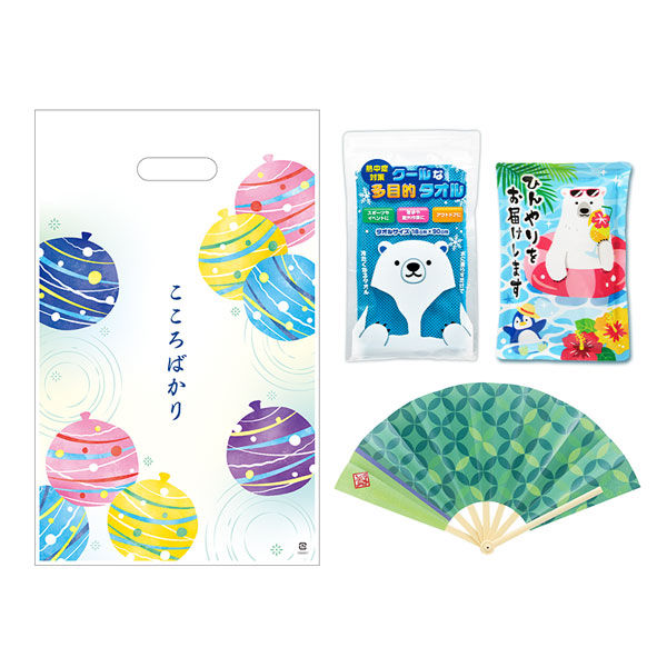 | カラー | 扇子:3種取り混ぜ、クールタオル:2種取り混ぜ(指定不可) |